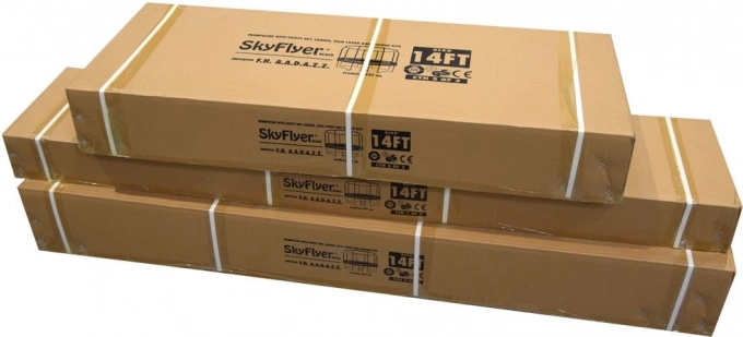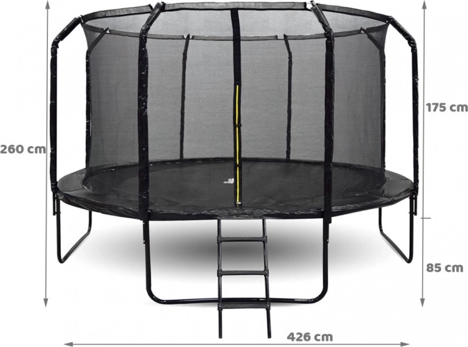 Robusten trampolin SkyFlyer s premerom 426 cm (14 ft) ponuja velikodušen prostor za skakanje, kondicijske vaje in prosti čas. Za varnost skrbi visoka varnostna mreža, napeta s pomočjo zgornjega obroča, ter mehko oblazinjeni profilirani stebri. Vstop je zavarovan z zadrgo in zaponko za maksimalno varnost otrok.