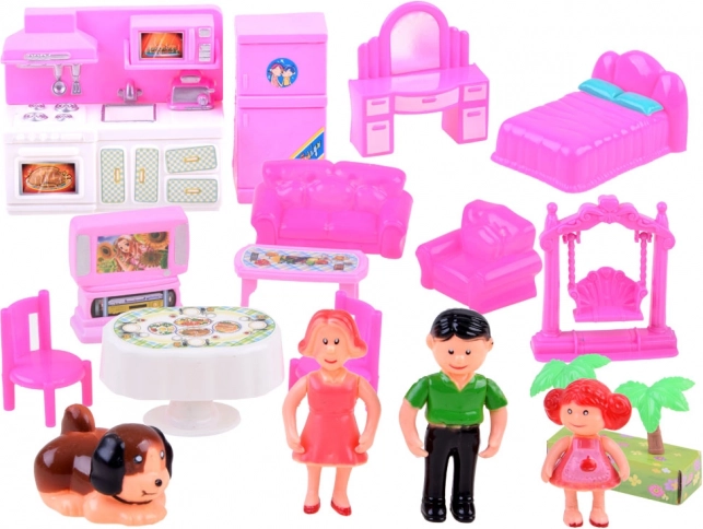 Opremlite spalnico, dnevno sobo in kuhinjo – v paketu najdete posteljo, kavč, naslanjač, mizo in stole, TV z omarico, kuhinjski niz ter hladilnik, poleg tega pa še figurice družinice in kužka.