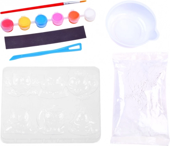 - Kalup z motivi sov, mavčni prah, mešalni lonček, lopatica/paletni nožek, čopič, 6 barv, magnetni trak