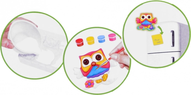 Odkrijte zabaven kreativni set za otroke, s katerim si izdelajo in pobarvajo lastne magnetke v obliki sov. Set spodbuja fino motoriko, ustvarjalnost in domišljijo – od ulivanja mavca do barvanja in lepljenja magnetnega traku. Ustvarite do 6 ljubkih sovjih magnetov za hladilnik, oglasno desko ali katero koli kovinsko površino.