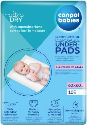 Večnamenske higienske podloge Canpol babies z vodoodporno zaščitno plastjo na spodnji strani so popolne za številne situacije. Super vpojne podloge hitro vpijajo tekočino in zadržujejo vlago v notranjosti podloge. Higienske podloge so nujne za ženske v poporodnem obdobju. Uporabne so pri previjanju dojenčka, med potovanjem, ob obisku klinike ali kot zaščita vzmetnice (pretečena plenica, polivanje ipd.) ter pri navajanju na odvajanje od plenic. Podloge z mehko zgornjo plastjo so nežne do kože, tehnologija za nevtralizacijo neprijetnih vonjav pa ohranja občutek svežine. Dermatološko testirano. Večnamenske higienske podloge Canpol babies so uporabne tudi za osebe z urinsko inkontinenco ter pri paliativni oskrbi. Pakiranje vsebuje 10 kosov velikosti 60 x 60 cm. Priporočeno s strani babice. *Pakiranje vsebuje 10 kosov. Dimenzije previjalnih podlog: širina 60 cm, dolžina 60 cm, debelina 8 mm. Primerne pri previjanju dojenčka ali za osebe z inkontinenco oziroma pri paliativni oskrbi. Super vpojna podloga hitro vpija tekočine in zadržuje vlago v notranjosti podloge. 60 x 60 cm – praktična velikost. S tehnologijo za nevtralizacijo vonjav. Mehka zgornja plast, prijazna do kože. Dermatološko testirano. Nujne za ženske v poporodnem obdobju. Uporabne pri negi in previjanju otrok. Zaščita posteljnine in vzmetnice pred nečistočami. Uporabne na poti in na sprehodu. Navodila za uporabo: Enkratne podloge. Iz higienskih razlogov jih redno menjajte. Po uporabi zavrzite. Opozorilo! Izdelek ni igrača. Hranite izven dosega otrok. Podloge ustrezajo zahtevam: Direktiva Evropskega parlamenta in Sveta 2001/95/ES o splošni varnosti proizvodov.