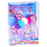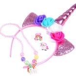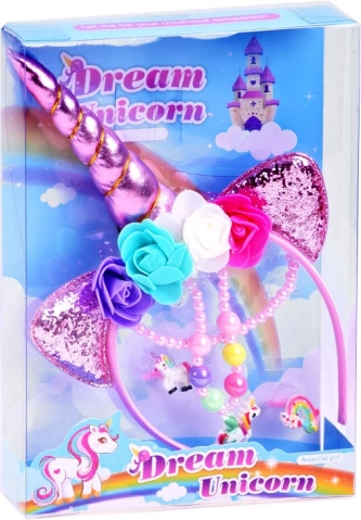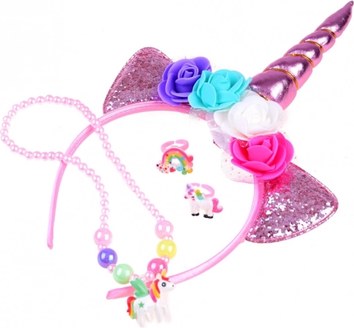 Ljubka set za male modne navdušenke vsebuje samorogov obroč za lase, barvno ogrlico in dva prstana. Obroč ima mehak, bleščeč rog, satenski premaz za udobje in cvetlične okraske. Odličen za pustovanje, rojstnodnevne zabave in vsakodnevno igro vile ali princeske. Udobno nošenje, bleščeči detajli in čaroben samorogov dizajn poživijo vsak kostum.
