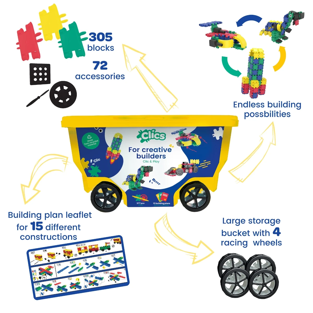 Odkrijte ustvarjalni svet gradbenega seta CLICS v praktičnem premičnem zaboju. Set vsebuje 377 delov v živih barvah in omogoča gradnjo avtomobilov, živalic, robotov, hišk ter drugih izvirnih stvaritev. Spajanje »na klik« je hitro, enostavno, končni modeli pa stabilni.