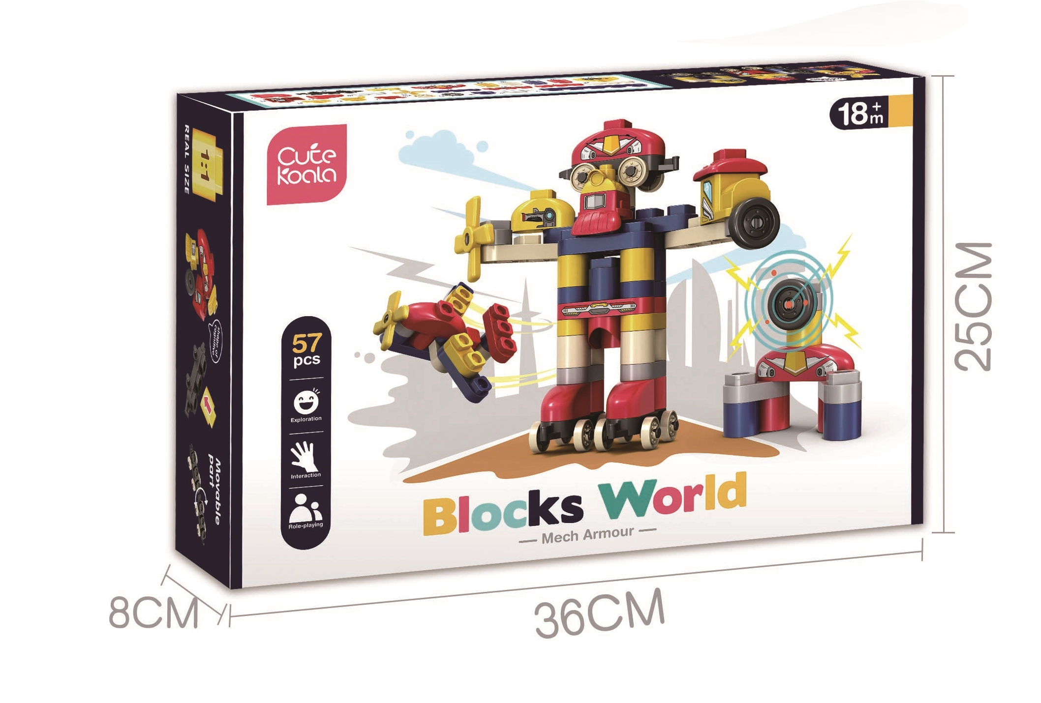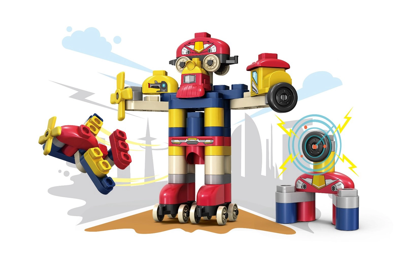 Kocke v slogu DUPLO, iz katerih lahko sestavite robota ali letalo. Zahvaljujoč kockam in nalepkam s podobami na njih se bo otrok lahko učil.