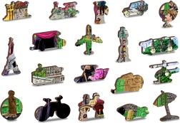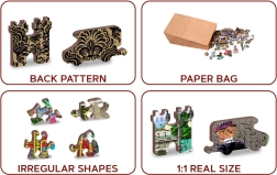 Ne zamudite priložnosti, da odkrijete lepoto edinstveno oblikovanih delcev naše sestavljanke WOODEN CITY. Vsak del je oblikovan z laserjem in nekateri v obliki živali, stavb ali predmetov, kar poveča estetsko vrednost rezultata. Sestavljanke so dvostranske, zato jih lahko sestavite tako kot kroga fotografije kot po vzorcu na drugi strani.