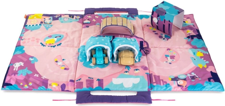 Skupaj s to mehko podlogo lahko otrok preživi ure in ure čudovitih dogodivščin. Podloga pomaga razvijati otrokove čute in domišljijo, saj ponuja številne senzorične elemente, kot so šumeči deli, most, tunel, poti in žepki za avtomobilčke.