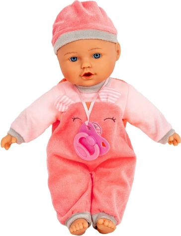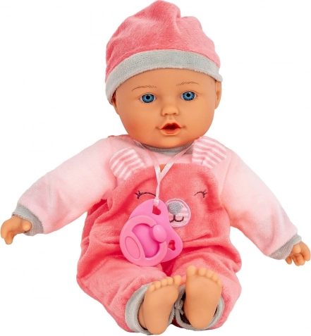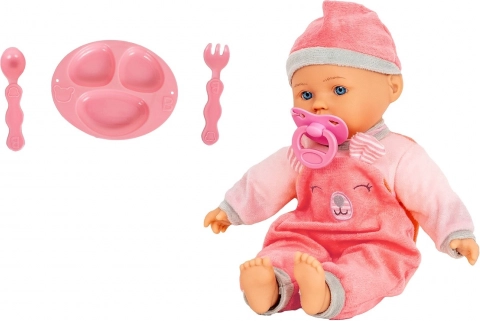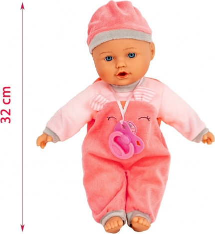 Gumijasta glavica, rokice in nogice z nežnimi potezami ter mehko tekstilno trebušček zagotavljajo pristeten občutek pri crkljanju in igri skrbi za dojenčka.