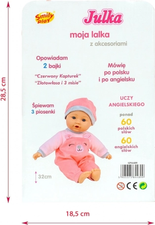 Ljubka punčka Julka bo razveselila vsako malo skrbnico. Govori in poje v poljščini in angleščini (več kot 60 besed v vsakem jeziku), pripoveduje pravljici Rdeča kapica in Goldilocks in trije medvedi, ima mehko telesce in realistične podrobnosti. Odlična igrača za razvoj ustvarjalnosti, finih motoričnih spretnosti in skrbniških veščin.