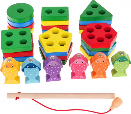 - leseno stojalo s količki in vdolbinami, - 4 krogi, .- 4 pravokotniki, .- 4 trikotniki, .- 4 kvadrati, .- 4 peterokotniki, .- 4 šestkotniki, .- 6 rib, .- ribiška palica z magnetom. . |