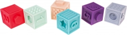 Komplet vsebuje 6 mehkih kock s številkami in reliefi. Spodbujajo zgodnje štetje, razvrščanje in zlaganje stolpov.