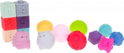 Ta bogat senzorični komplet 16 kosov bo razveselil otroke od 6 mesecev in jim ponudil varno zabavo doma in v kadi. Različne teksture, barve in oblike naravno spodbujajo raziskovanje, stiskanje in gradnjo. Večje žogice ob stisku oddajajo zvok, ki spodbuja radovednost in koncentracijo.