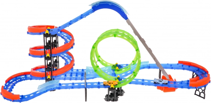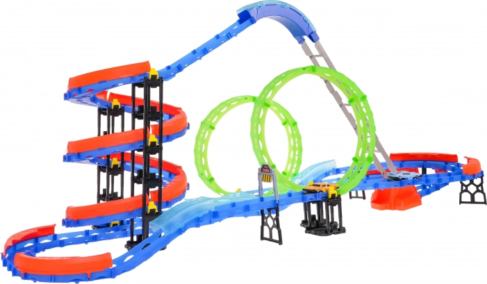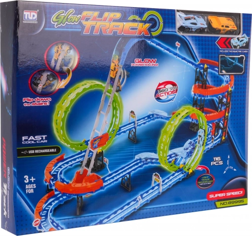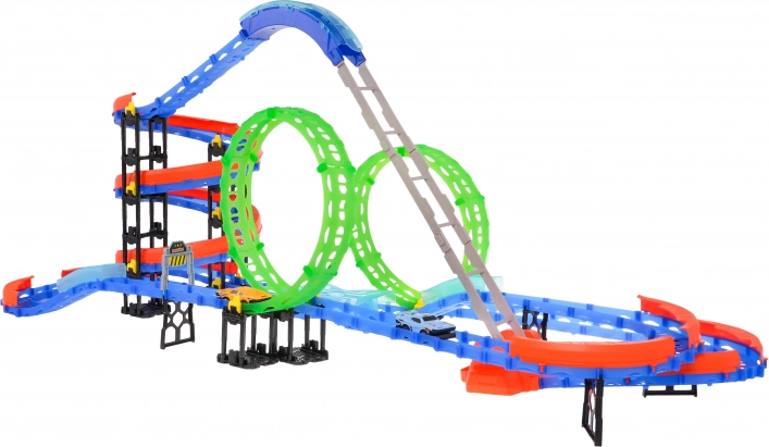 Velika, večnivojska dirkalna proga za otroke od 3 let ponuja akcijsko vožnjo z dvema 360° zankama, spiralami in ostrimi ovinki. Vključuje 2 hitra avtomobilčka z osvetlitvijo in USB polnjenjem, ki vozita po svetlečih fluorescentnih delih proge. Set vsebuje 116 gradbenih delov za ustvarjalno sestavljanje in dolge ure zabave.