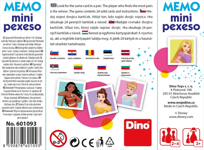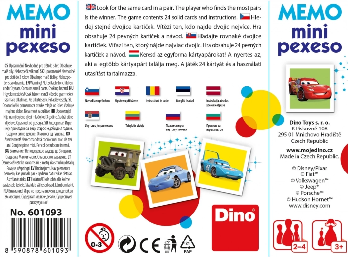 Vsak paket vsebuje 24 trdnih kartic (12 parov), ki otroke učijo zbranosti ter urijo njihov spomin in pozornost. Kakovostna izdelava iz odpornega, zdravstveno neoporečnega kartona ter proizvodnja v Češki republiki sta jamstvo za dolgo življenjsko dobo in varno zabavo.