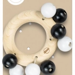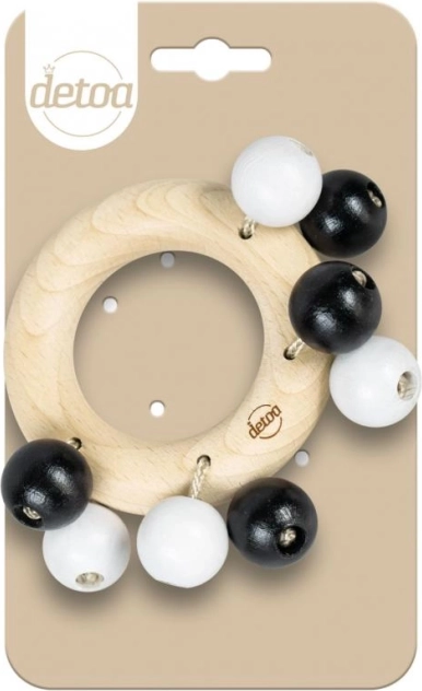 Kontrastna črno-bela izvedba pritegne otrokovo pozornost, nežno ropotanje pa spodbuja prijemanje in tresenje. Ergonomičen obroček se udobno prilega majhnim ročicam, gladka lesena površina pa je prijetna na dotik.