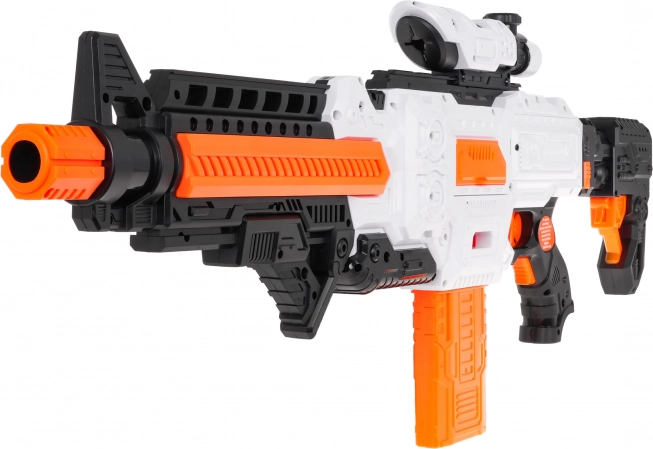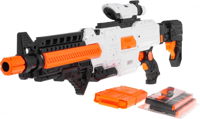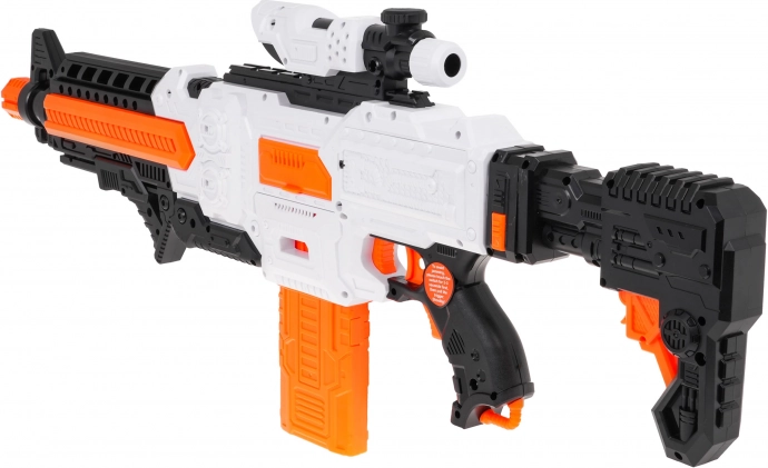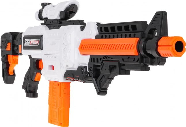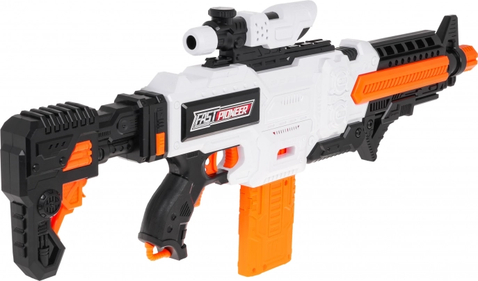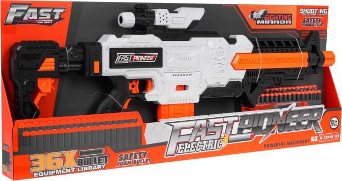Blaster Fast Pioneer v belo‑oranžno‑črni barvni kombinaciji je idealen za domače in zunanje bitke. Polsamodejni mehanizem z vzmetjo zagotavlja hitro in gladko streljanje po enem strelu. Dovolj je napolniti nabojnik, pridržati gumb za napajanje, nameriti in pritisniti sprožilec.