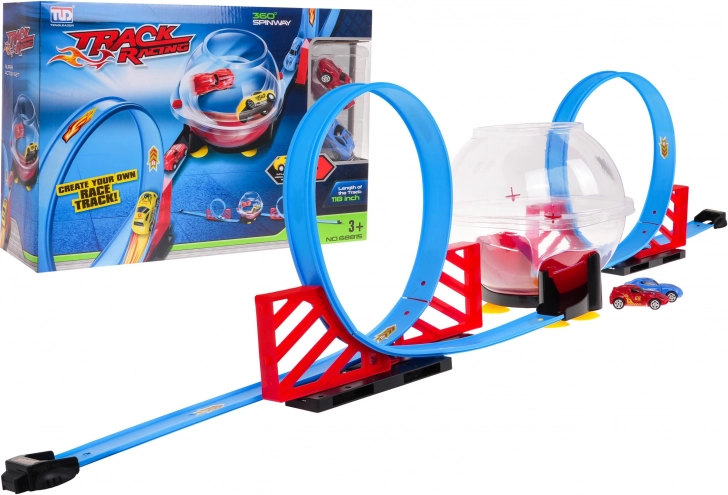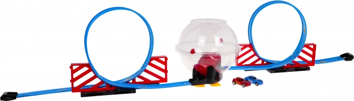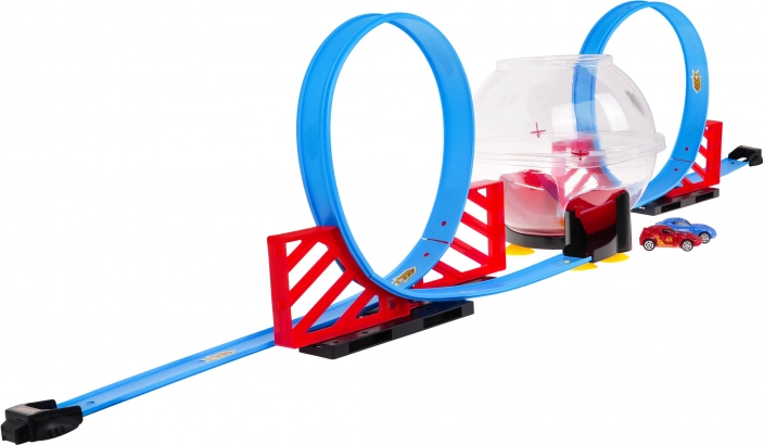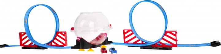 Zgradite svojo dirkalno areno z dvopasovno stezo, dvema zankama in osrednjo prozorno kroglo. Zahvaljujoč dvema neodvisnima trasama lahko otroci pripravijo prave obračune hitrosti. Z vlekom avtomobilčka nazaj se aktivira pull back pogon, avtomobilček pa se požene proti zanki, zapelje v kroglo in v notranjosti izvaja razburljive vrtenje.