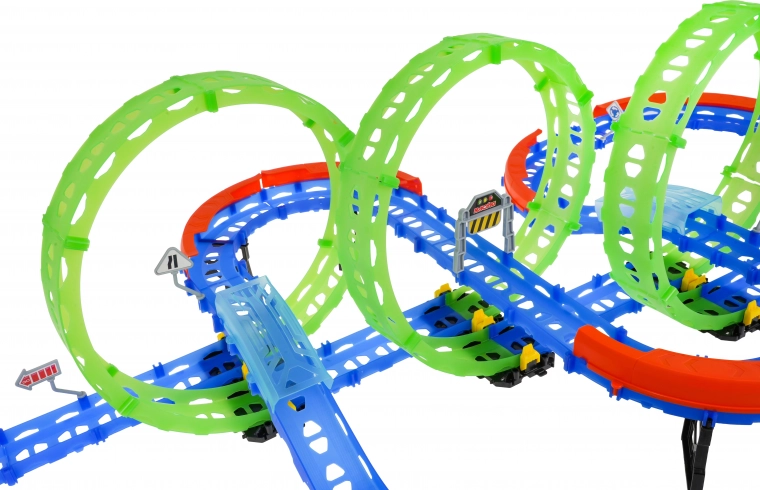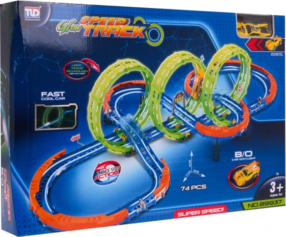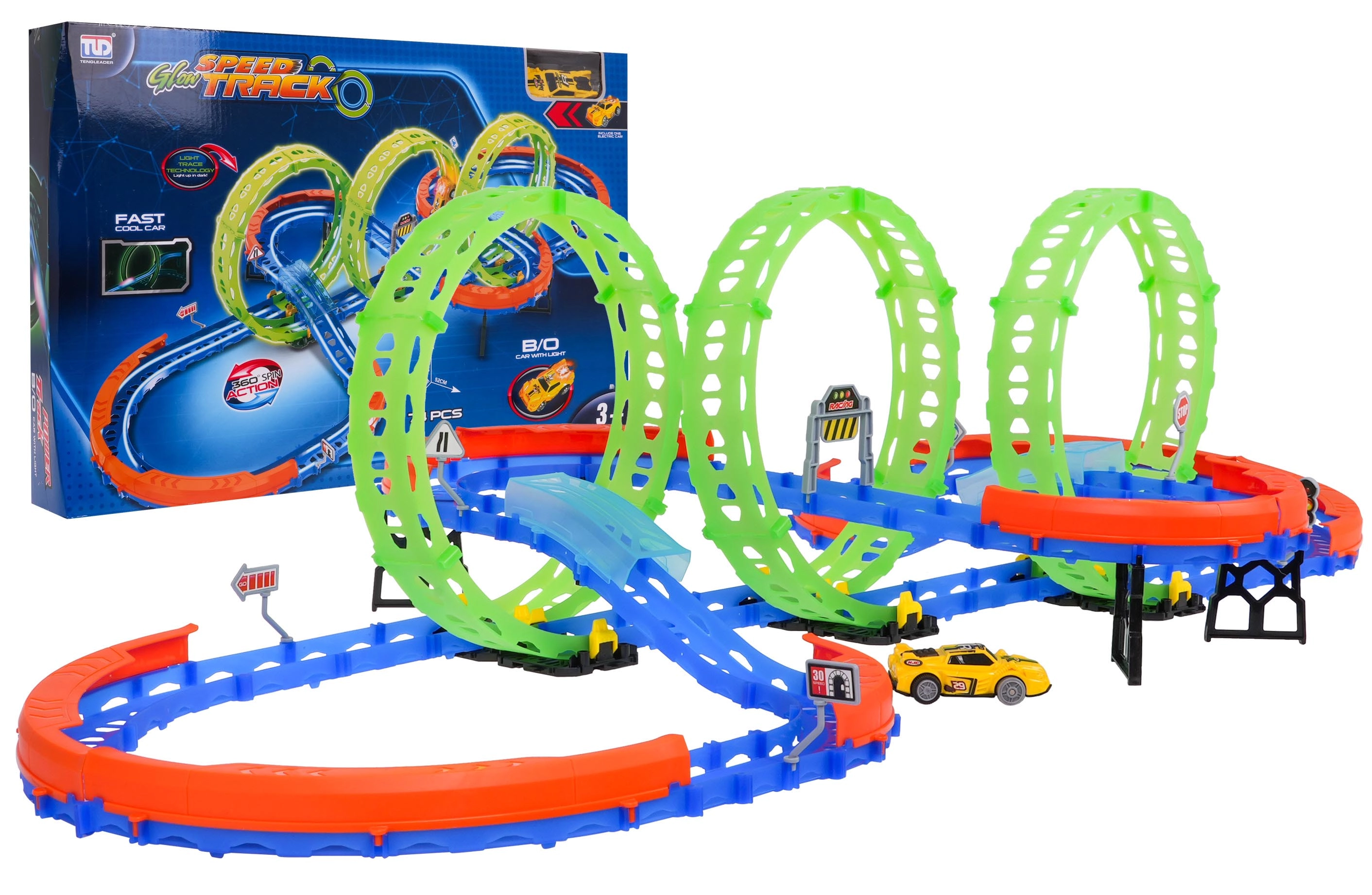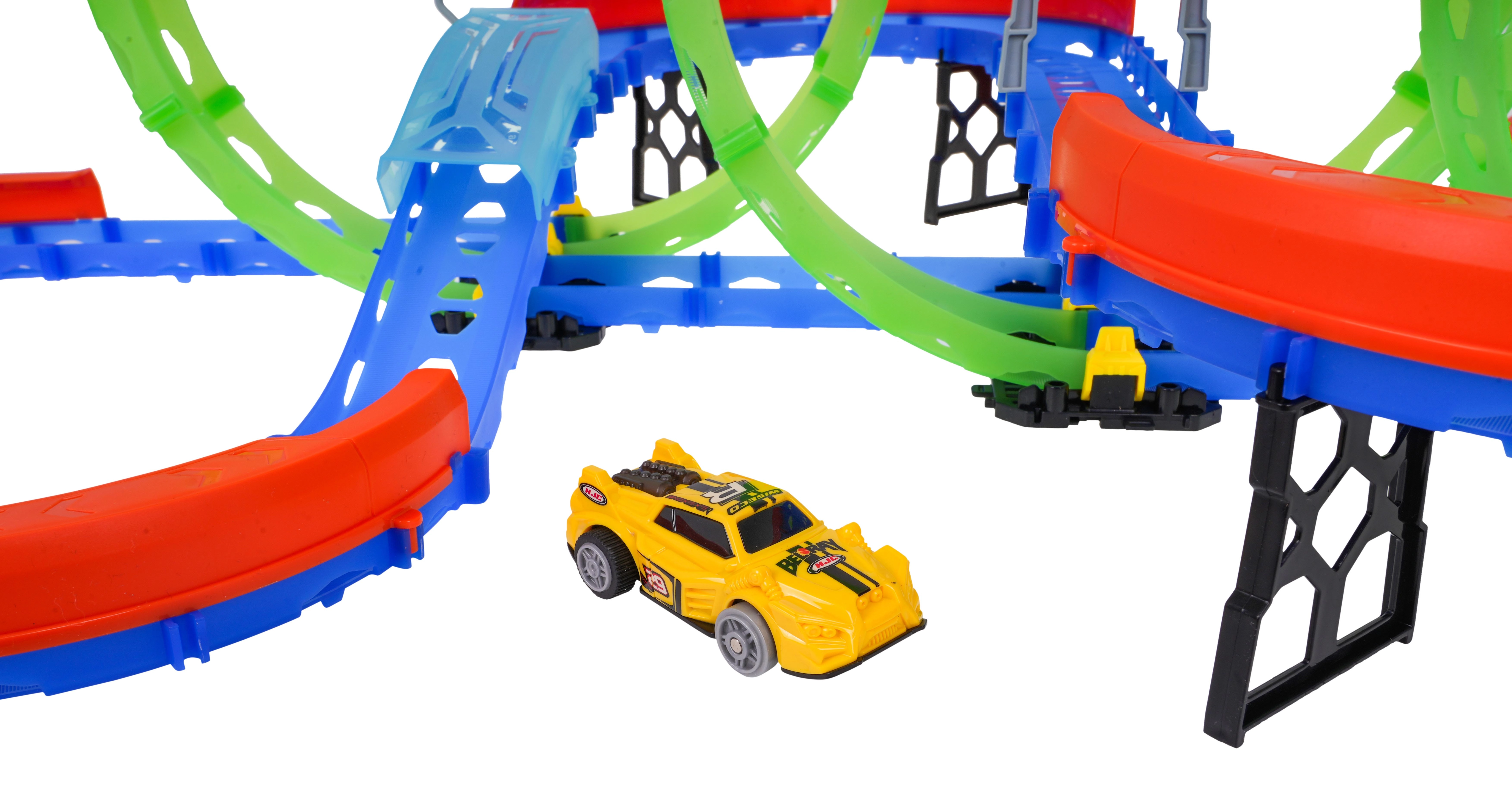 Zgradite svoj dirkalni krog s tremi velikimi zankami in uživajte v napeti vožnji z LED avtomobilčkom. Zahvaljujoč fluorescenčnim elementom proga sveti v temi, zato so dirke odlične tudi zvečer. Stabilna konstrukcija, zaščitne ograjice in raznoliki odseki poskrbijo za gladek prehod in visoko hitrost.
