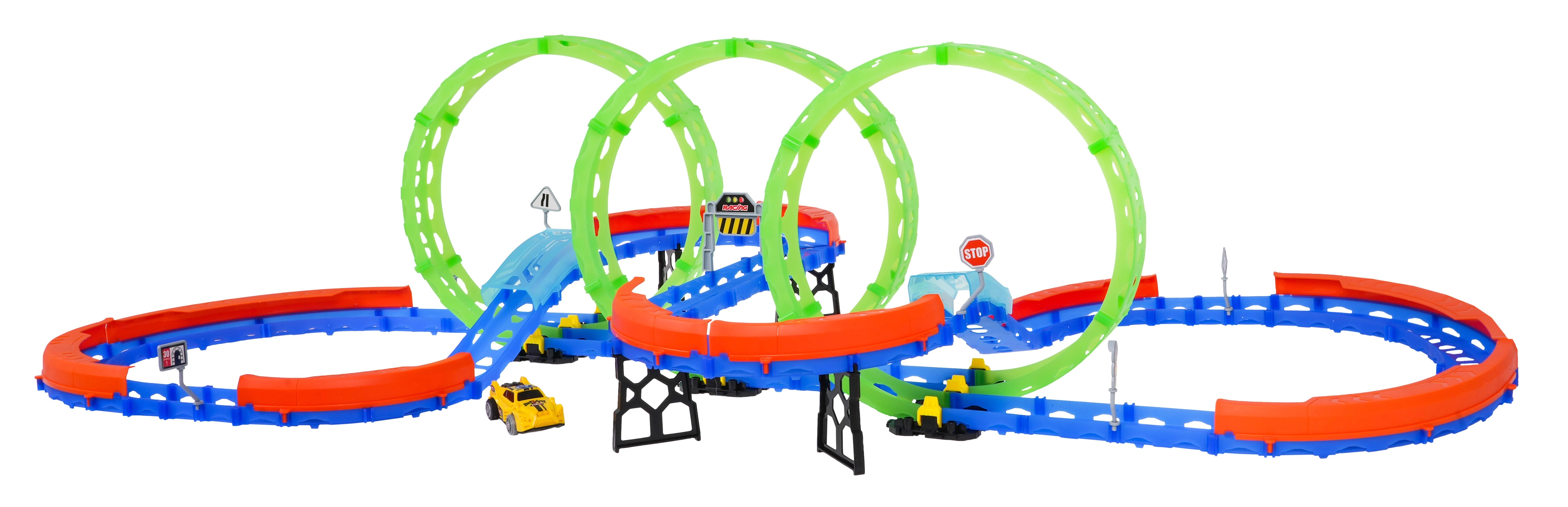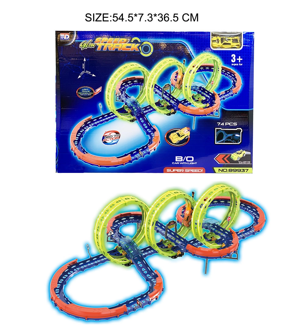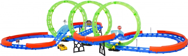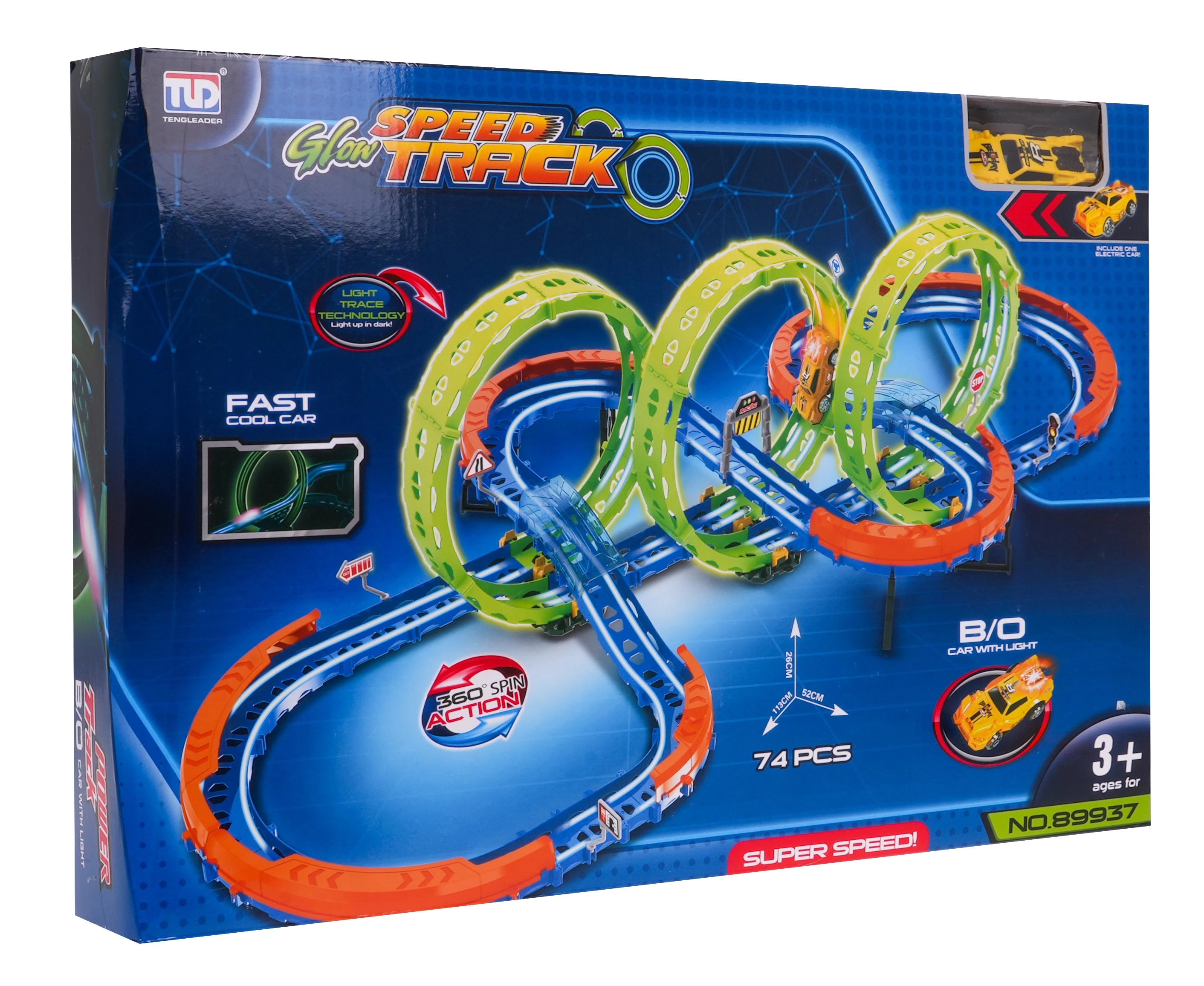 Zgradite svoj dirkalni krog s tremi velikimi zankami in uživajte v napeti vožnji z LED avtomobilčkom. Zahvaljujoč fluorescenčnim elementom proga sveti v temi, zato so dirke odlične tudi zvečer. Stabilna konstrukcija, zaščitne ograjice in raznoliki odseki poskrbijo za gladek prehod in visoko hitrost.