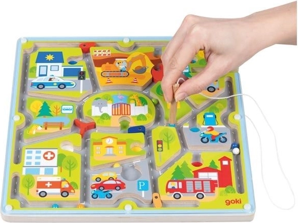 Odkrijte zabavni magnetični labirint mesto znamke GOKI, kjer otroci z magnetnim peresom vodijo avtomobilčke po ulicah, polnih križišč in prepovedi. Igra razvija fino motoriko, koncentracijo in osnovno prometno ozaveščenost zahvaljujoč jasnim vizualnim dražljajem ter varni leseni izvedbi.