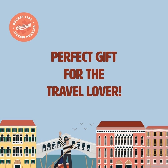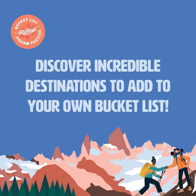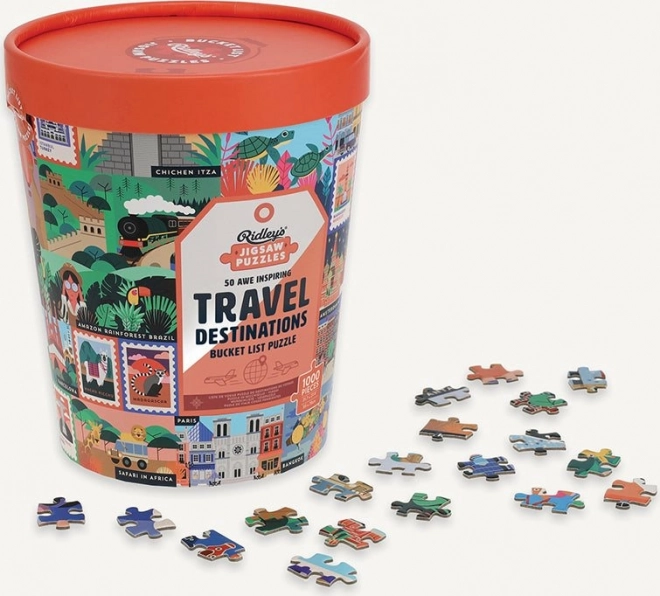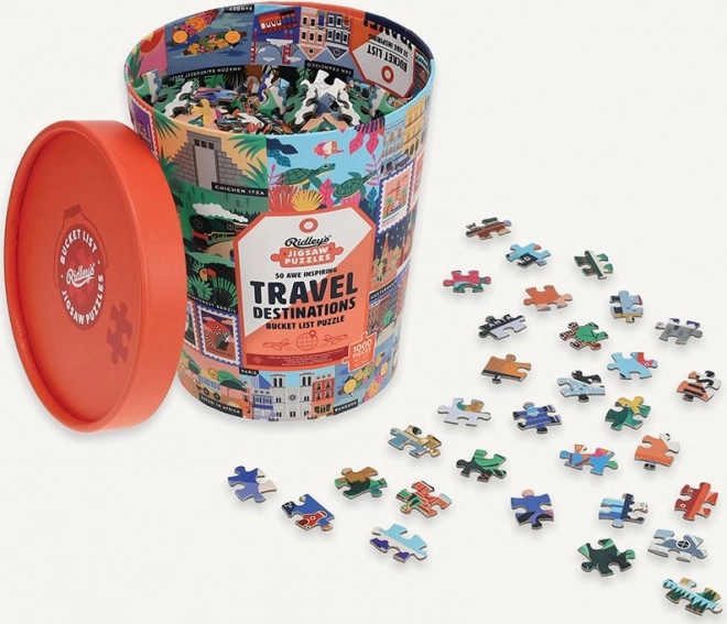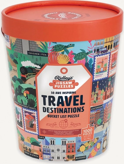 Sestavljanka Ridley's Games Bucket List: 1000 koščkov, 50 ikoničnih destinacij, slogovno vedro in vzorčni plakat. Odlično darilo za ljubitelje potovanj.
