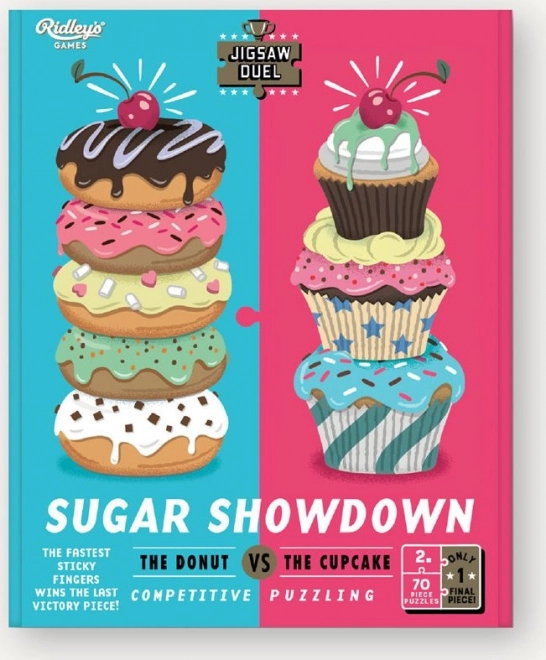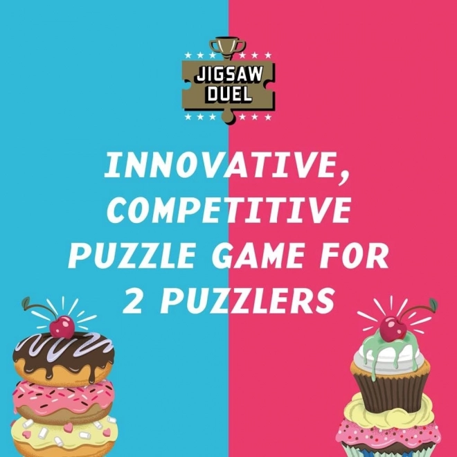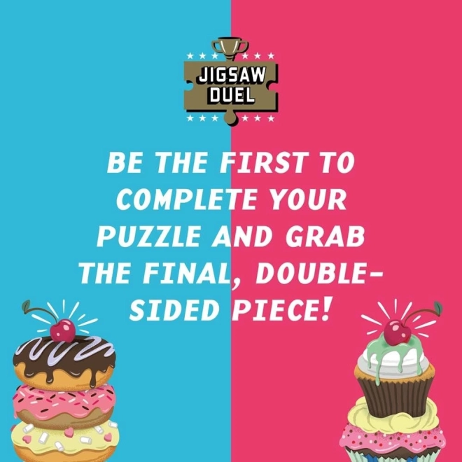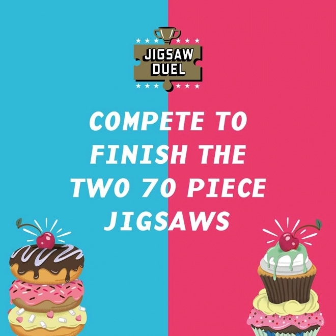 Uživajte v napetem sestavljalskem izzivu za dva s Puzzle dvobojem Sladka obračunava: krof proti kolačku. Dve mini sestavljanki po 70 koščkov, tekma za zadnji skupni košček in barvni predlogi v paketu zagotavljajo odlično zabavo za pare, prijatelje in družine.