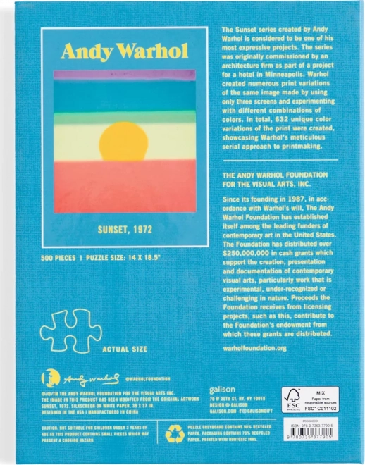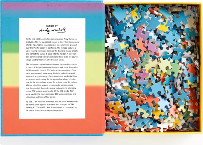 Odkrijte izvirno 500-delno sestavljanko z motivom ANDY WARHOL: Sončni zahod, ki združuje umetnost in zabavo v eno izjemno doživetje. Zaradi kompaktnih dimenzij po sestavi in elegantne embalaže je odlična kot darilo in kot dizajnerski kos v knjižni polici.
