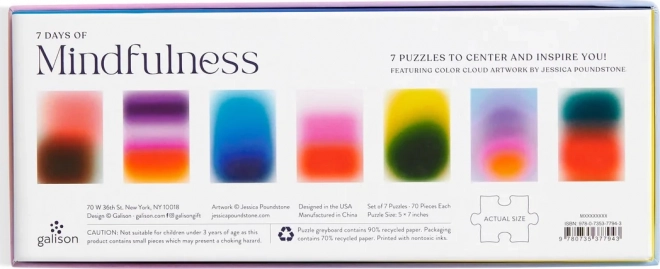 Komplet »7 dni mindfulness« ponuja sedem izvirnih mini sestavljank z abstraktnimi barvnimi oblaki JESSICE POUNDSTONE. Vsaka sestavljanka ima 70 koščkov in po sestavi meri približno 17,8 × 12,7 cm – idealna velikost za kratko, pomirjujoče sestavljanje doma in na poti. Embalaža je estetsko oblikovana in iz recikliranega papirja, kar bo razveselilo ljubitelje dizajna in trajnosti.