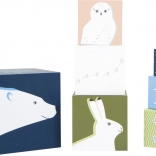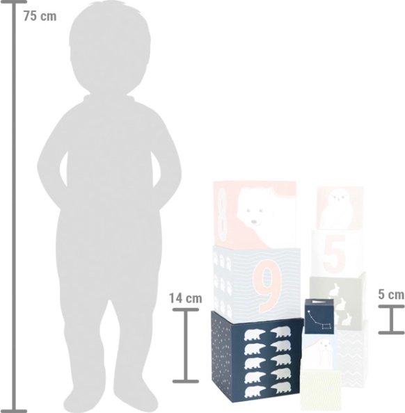 Dizajn kock vključuje tako realistične portrete znanih polarnih živali kot abstraktne vzorce, ki spodbujajo otroško domišljijo. Po igri lahko kocke preprosto zložite eno v drugo in tako prihranite prostor.