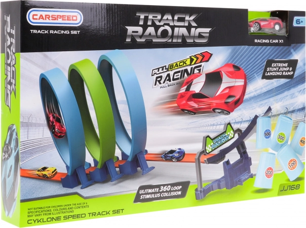 Zabavna dirkalna proga s trojnim loopingom, avtomobilčkom s pull-back pogonom in ovirami v obliki sodov za otroke od 6 let. Avtomobilček samo potegni nazaj, spusti in opazuj, kako premaga 3 zanke, prebije rampo in podre ovire – vse to brez baterij.