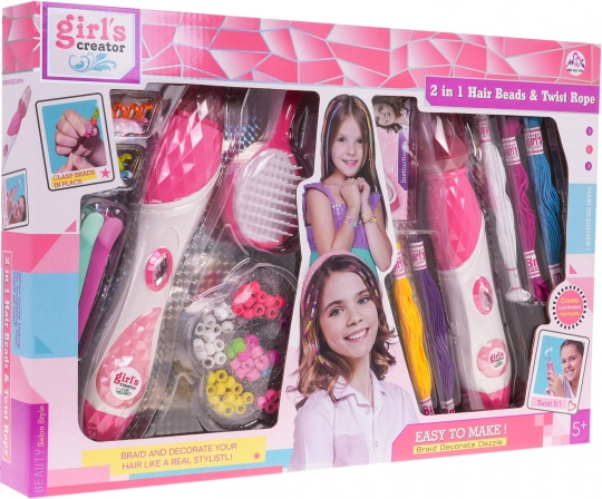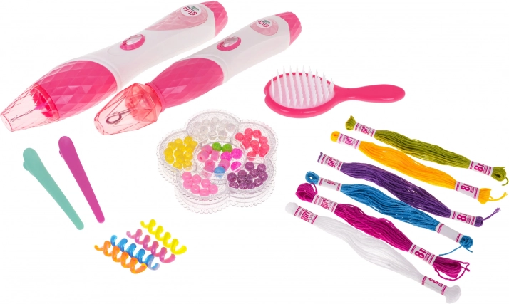 Ta zabavni komplet razvija kreativnost in fino motoriko. Z aplikatorjem preprosto namestite kroglice v lase – dovolj je vstaviti kroglico, ujeti praminek s kavljem in potisniti drsnik. Za prepletanje kitk iz muline uporabite baterijski strojček: razdelite pramene, pritisnite gumb in v hipu imate pripravljen okrasni trak, ki ga v lase pritrdite s sponko.