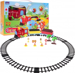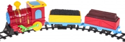Komplet vsebuje lokomotivo, 2 vagona in tire v krog s premerom približno 72,5 cm, poleg tega pa še znake, stožce in drevesca.