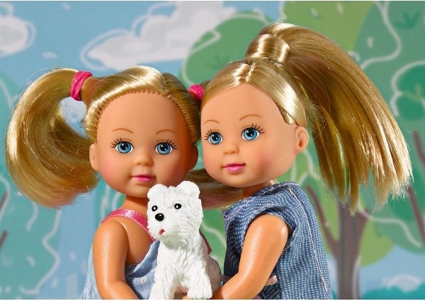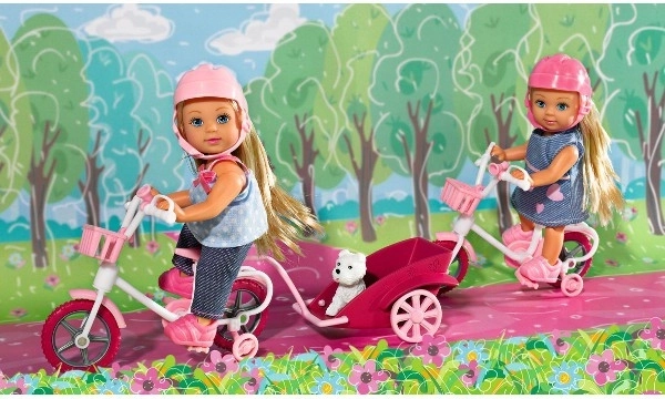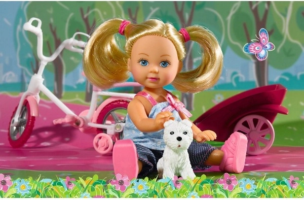 Punčka Evi Love prinaša otrokom čudovite zgodbe, polne dogodivščin. S triciklom in odstranljivo prikolico lahko Evi varno vozi svojega belega kužka na izlete. Zaradi gibljivih kolen zlahka sedi na kolesu, otroci pa lahko uživajo v realistčni igri z poudarkom na gibanju in skrbi za žival.