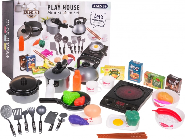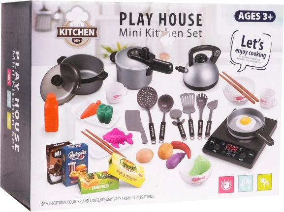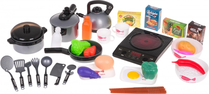 Ta odličen kuhinjski set vsebuje vse, kar lahko potrebuje mali kuhar. Indukcijski kuhalnik, ki deluje na tri baterije AA, omogoča realistične zvoke pečenja in kuhanja, varni plastični elementi, kot so lonci, ponve in drugi dodatki, pa so idealni za otroško igro, brez ostrih robov in tveganja poškodb. Set vključuje različne imitacije živil, vključno z jajci, ribo in zelenjavo, ki igri dodajo pristnost.