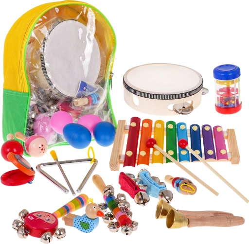 Predstavljamo velik lesen set glasbenih instrumentov za otroke od 2 let dalje. Ta barvit in varen set vsebuje 23 različnih predmetov, vsi so shranjeni v praktičnem nahrbtniku, ki ga je enostavno prenašati.