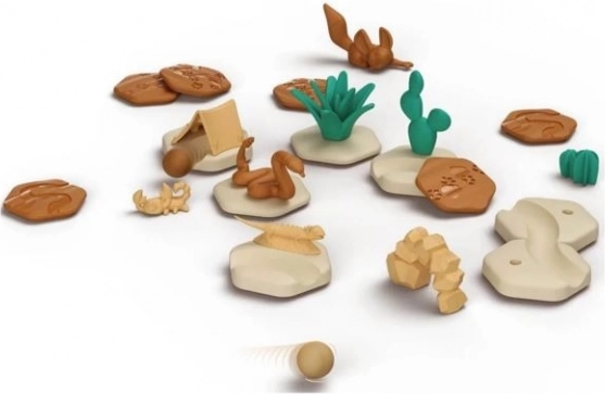 Odkrijte svet gravitacijskih stez za najmlajše z razširitvijo Puščava za GraviTrax Junior. Dodajte osnovnemu setu novo tematsko pokrajino z peščenimi sipinami, skalnimi oblikami in kaktusi, kjer kroglica šviga skozi neusmiljeno puščavo in srečuje feneka, kačo in škorpijona. Vsi seti GraviTrax Junior so med seboj kompatibilni, zato vas pri ustvarjalnem gradnji omejuje le domišljija.