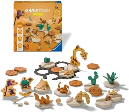 Razširitveni set Puščava prinaša v vaš svet GraviTrax Junior novo pustolovsko pokrajino. Dopolnite začetni set s tematskimi elementi, preoblikujte progo in pustite kroglici, da se podi med skalami in kaktusi. Otroci na igriv način urijo fino motoriko, ustvarjalnost in prve STEM veščine.
