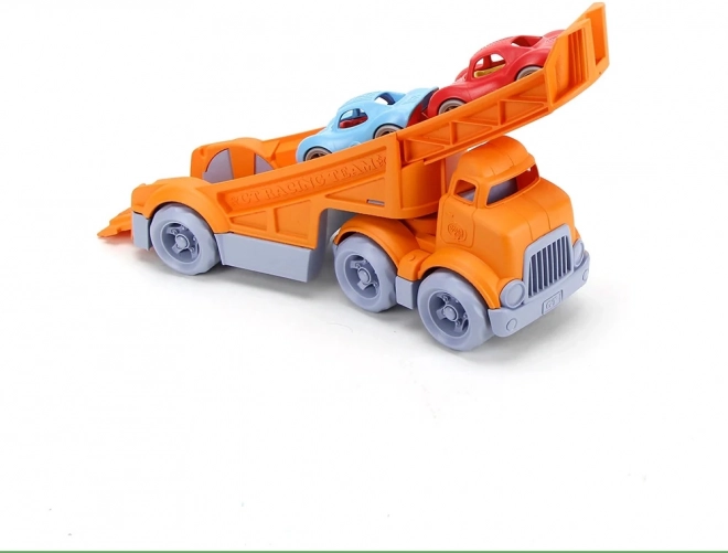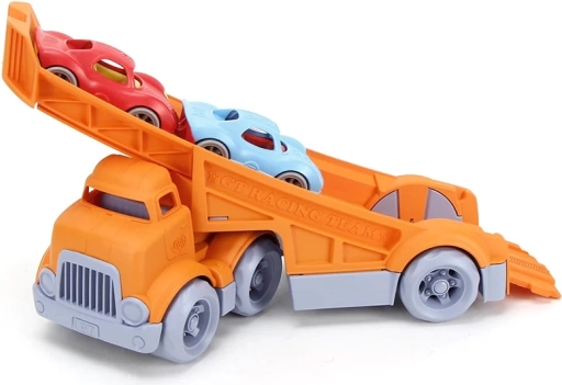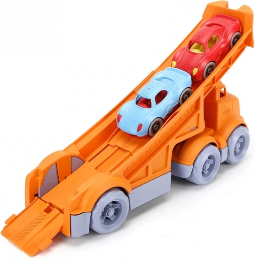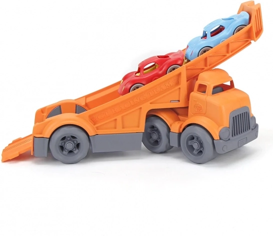 Ekološki transportni set znamke Green Toys prinaša varno in zabavno igro za najmlajše. Robustni oranžni kamion z dolgo nakladalno rampo prevaža dva barvna dirkalna avtomobilčka. Izdelano iz reciklirane plastike plastenk za mleko, brez BPA, ftalatov in PVC, primerno za doma, peskovnik in vodo. Enostavno vzdrževanje – primerno za pomivanje v pomivalnem stroju.