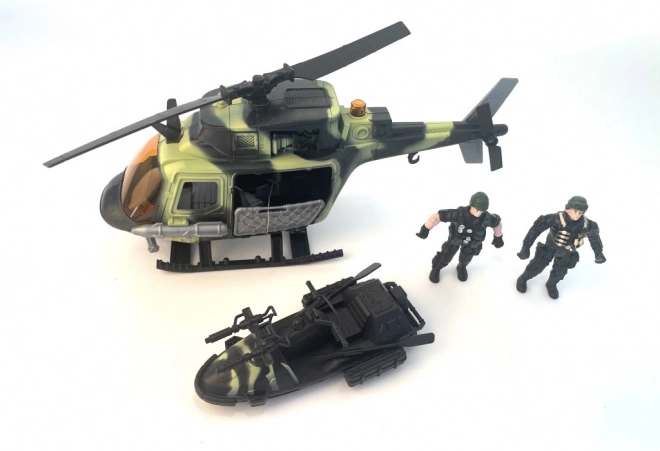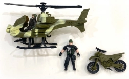 Komplet vključuje helikopter in terensko vozilo, kar omogoča prilagodljivo izbiro igrač za različne igralne scenarije.