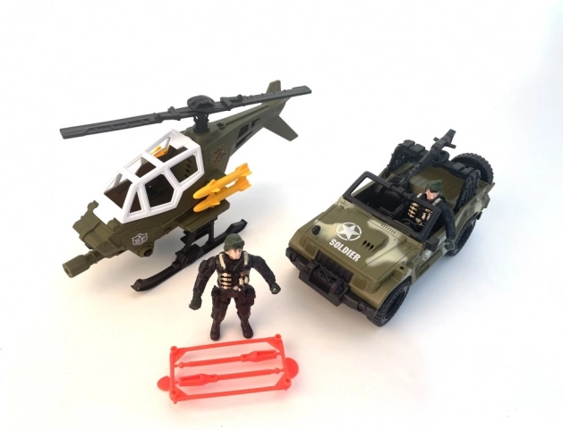 Vojaški set vozila in helikopterja ponuja zabavo za vse male ljubitelje vojske. Vsebuje vozilo, helikopter, dva vojaka in številne dodatke za ure kreativne igre.