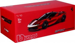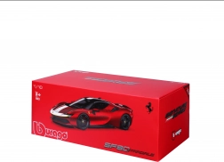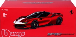 Model Ferrari SF90 Stradale Assetto Fiorano 2020 znamke Bburago zvesto povzema karakter prvega priključno-hibridnega vozila FERRARI. Posebna izdaja Assetto Fiorano je osredotočena na maksimalne zmogljivosti in vozne lastnosti – ti elementi se odražajo tudi v natančni modelski izvedbi. Rdeč lak s kontrastnimi detajli poudarja športni dizajn in aerodinamične linije.