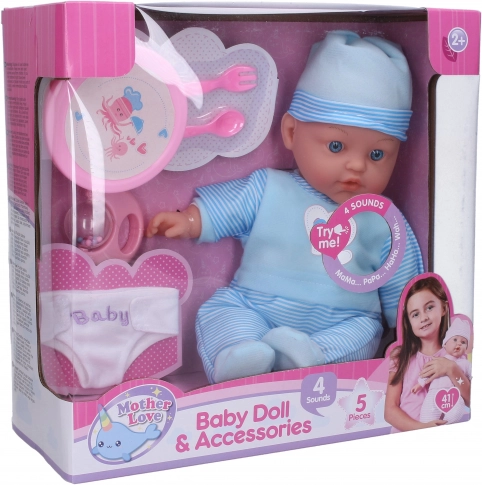Ljubek dojenček z zvoki velikosti 41 cm bo razveselil vsakega malega skrbnika. Ima mehko telesce, ob stisku trebuščka oddaja realistične zvoke (mama, očka, smeh, čebljanje) in priloženi so praktični dodatki za igro. Na voljo v 2 barvnih različicah – rožnata in modra.