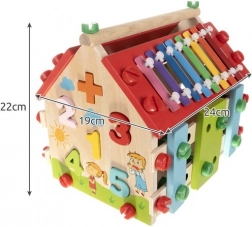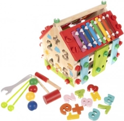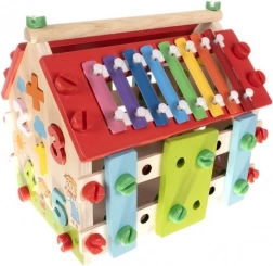 Vsaka stran hiške ponuja različne aktivnosti, ki spodbujajo otrokovo razvoj. Vključuje činele, vstavljanke oblik in udarno kladivce.