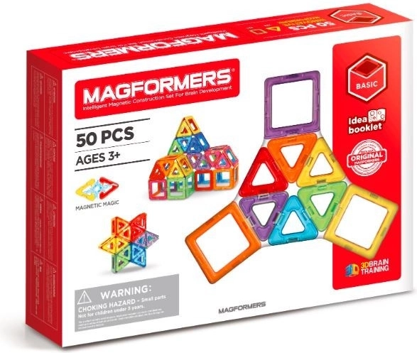 MAGFORMERS SET 50 so bloki z vgrajenimi močnimi neodimskimi magneti, ki se med seboj vedno privlačijo. Dovolj je, da približate stranici dveh blokov in takoj se povežeta. Zahvaljujoč blokom, oblikovanim po geometrijskih likih, lahko gradite čudovite tridimenzionalne konstrukcije. Pri igri lahko uporabite priložena navodila ali dodatne primere na straneh magformersworld.com oziroma lastno domišljijo. Set vsebuje: 26 trikotnikov in 24 kvadratov.