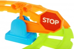 vlak, vagon, premično zaporo, 6 barvnih tirnic, 2 figuri živali (slon in krava)