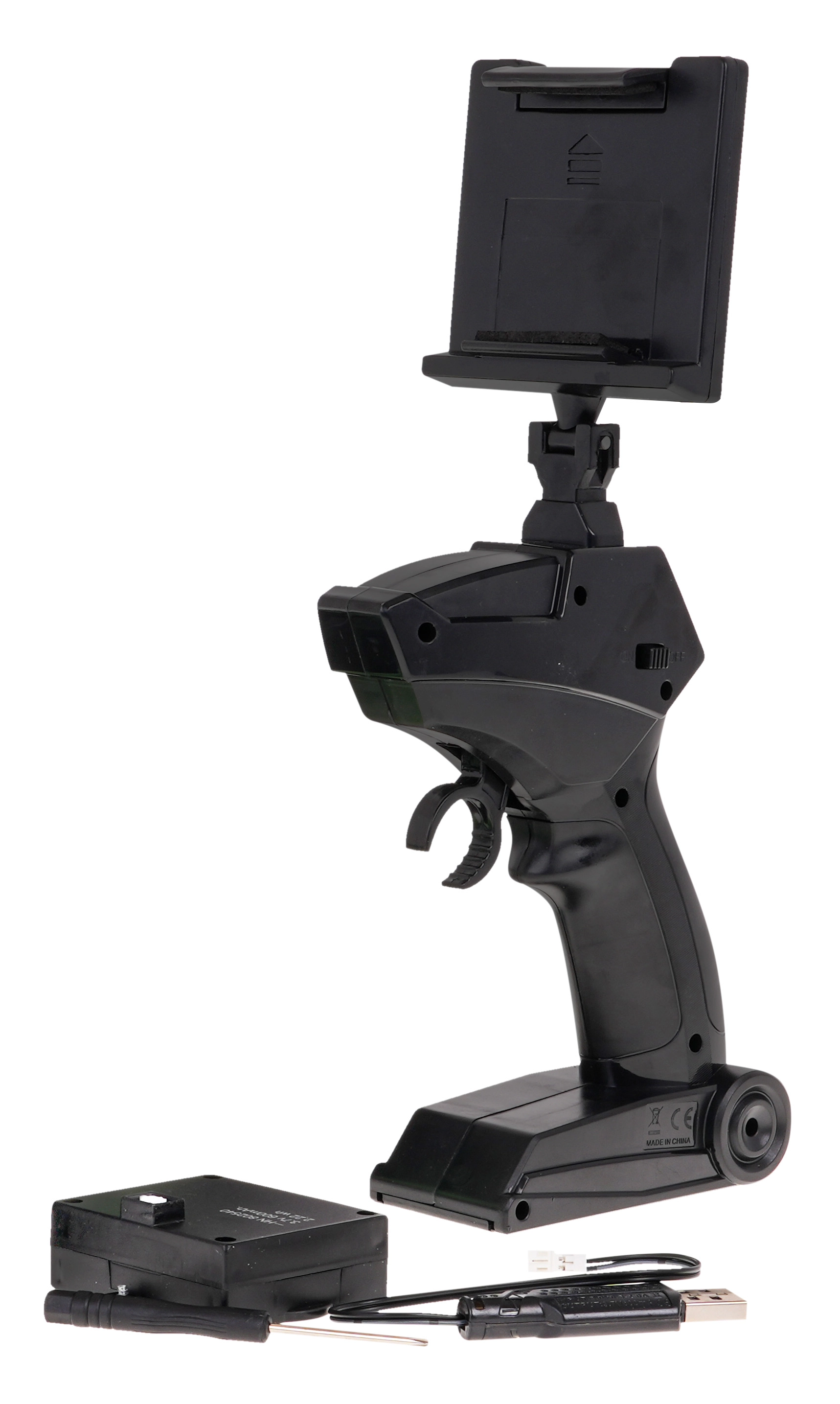 Pistolni upravljalnik z natančnim krmiljenjem in nosilcem za telefon ponuja stabilen doseg brez motenj. Podpira vožnjo naprej/nazaj, gladko zavijanje in fino korekcijo smeri.