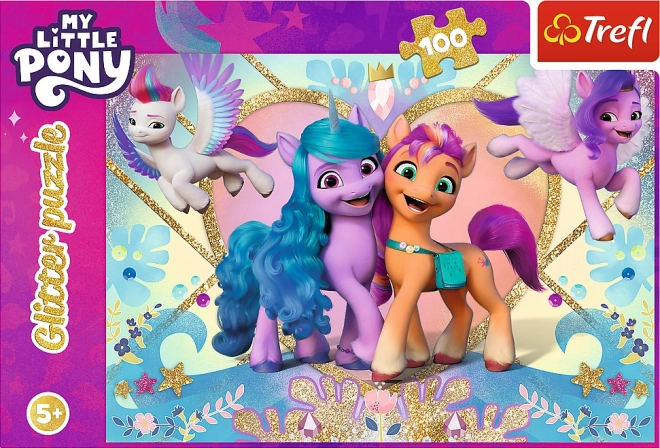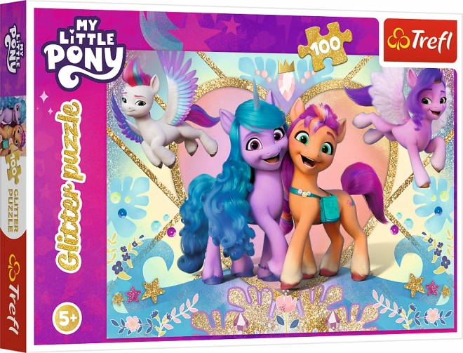 Sestavljanka Glitter s 100 kosi My Little Pony Bleščeči poniji je zasnovana posebej za ljubitelje ponijev. Vsak kos in embalaža sta prekrita z nežnimi zlatimi bleščicami, ki dodajo vsakemu motivu razkošen videz. Sestavljena slika bo čudovita, bleščeča dekoracija otroške sobe.
