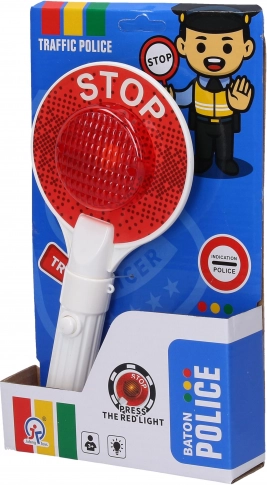 Realistična policijska loparica za otroške igre in vadbo varnega vedenja. Ena stran sveti rdeče, druga zeleno, ne manjkajo svetlobni učinki in baterije 3× AG13 v kompletu. Kompaktna dolžina 23 cm za enostaven oprijem.