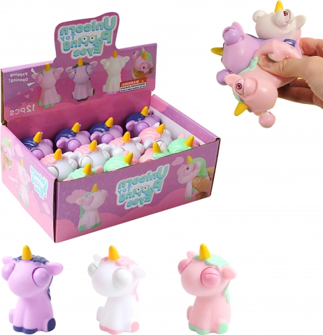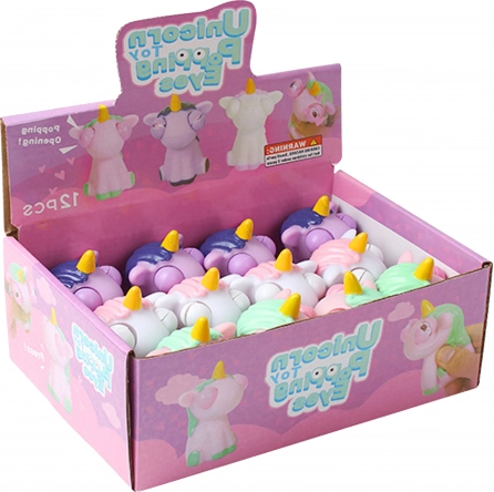 Ljubek stiskalni samorog 8 cm za lajšanje stresa. Tri barve, mehak material, display box 12 kosov. Idealno darilo za otroke in odrasle.