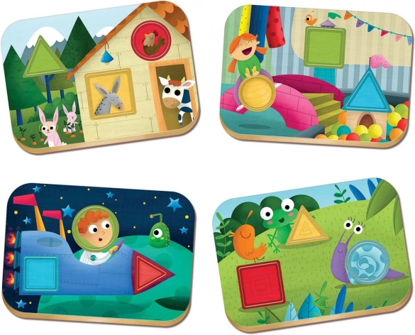 Ta igra spodbuja otrokovo pozornost, razvija njihovo domišljijo in jih uči prepoznavati osnovne geometrijske oblike in barve v različnih okoljih: na kmetiji, v igralnici, na travniku in v vesolju.