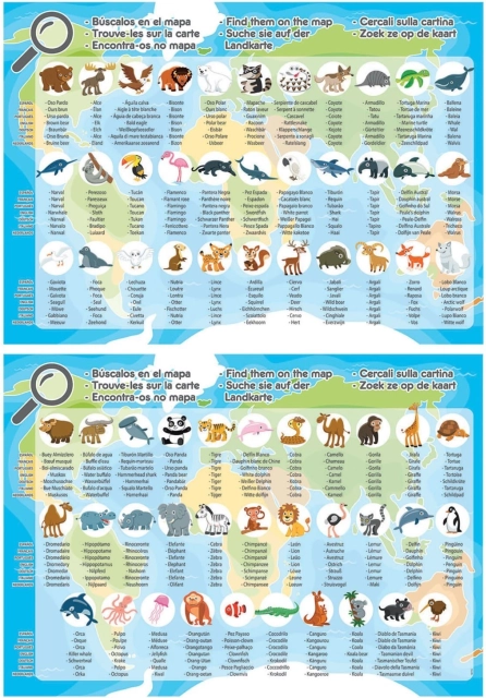 Geografske puzzle za otroke z ilustracijami živali sveta. Na puzzlah boste našli pingvine, kamele ali na primer bizona. Imena celin in oceanov so v angleščini. Del pakiranja je tudi informativna zloženka z imeni vseh živali (špansko, francosko, portugalsko, angleško, nemško, italijansko, nizozemsko). Ko puzzle sestavite, se lahko igrate igro iskanja slik. Kdo jih bo našel vse? Dimenzije sestavljenih puzzlov približno 48 × 34 cm